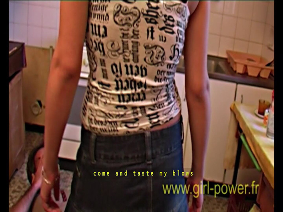 Beaten in the kitchen. As Jennifer is doing her house work, her boyfriend is in a hurry, to have his dinner. A little bit too much of a hurry, according to Jennifer who will teach him a lesson. Throughout the clip, she will beat him , using various objects all of which can be found in the kitchen : sink, pans, freezer, casseroles, etc. This very imaginative young lady will not give him any respite and will destroy him continuously, using anything within reach. This video has English sub-titles.