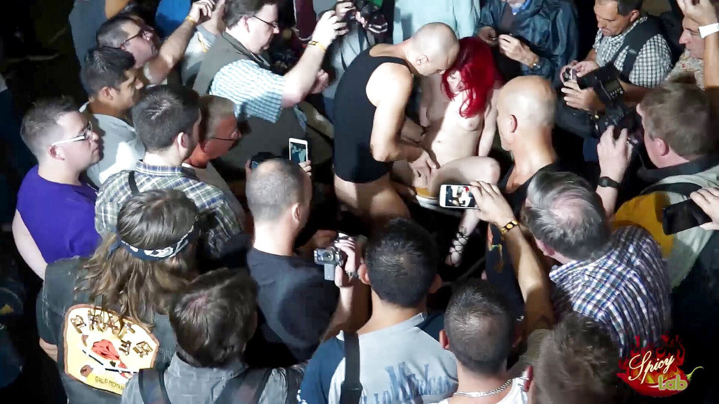 Public fuck among the people for Capitano Eric and redhead young actress Valentina Palermo: exhibitionist couple in a liveshow at salon erotica de Barcelona