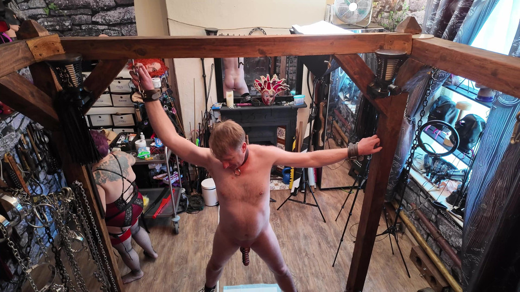 Mistress Izar finally finished putting her slave (Latex Bubble) into the gates of hell, then introduces some more sensual pay before finding dome kitchen implements to spank him with